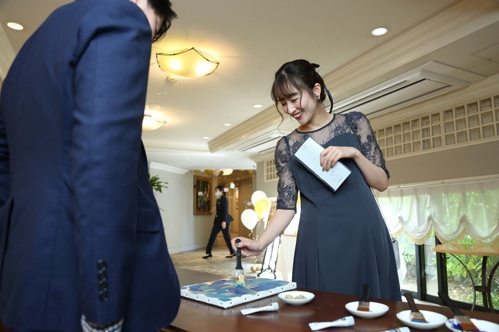 みんなで完成させたウエディングキャンパスはそれぞれの好きな色と塗り方でオリジナルな作品が仕上がり、世界で1つだけの結婚証明書ができたことも今では素敵な思い出です。