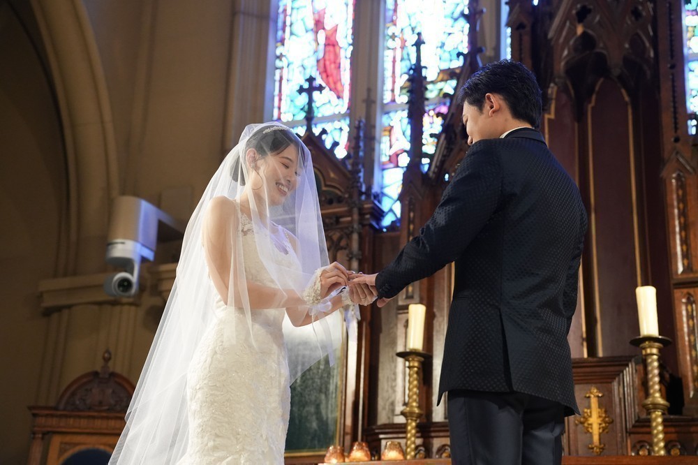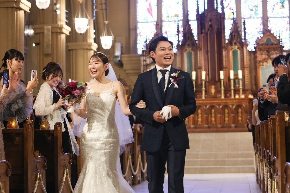 挙式は自然光がたくさん入る天井も高い壮麗な大聖堂で、マーメイドドレスを着て挙式を行いました。