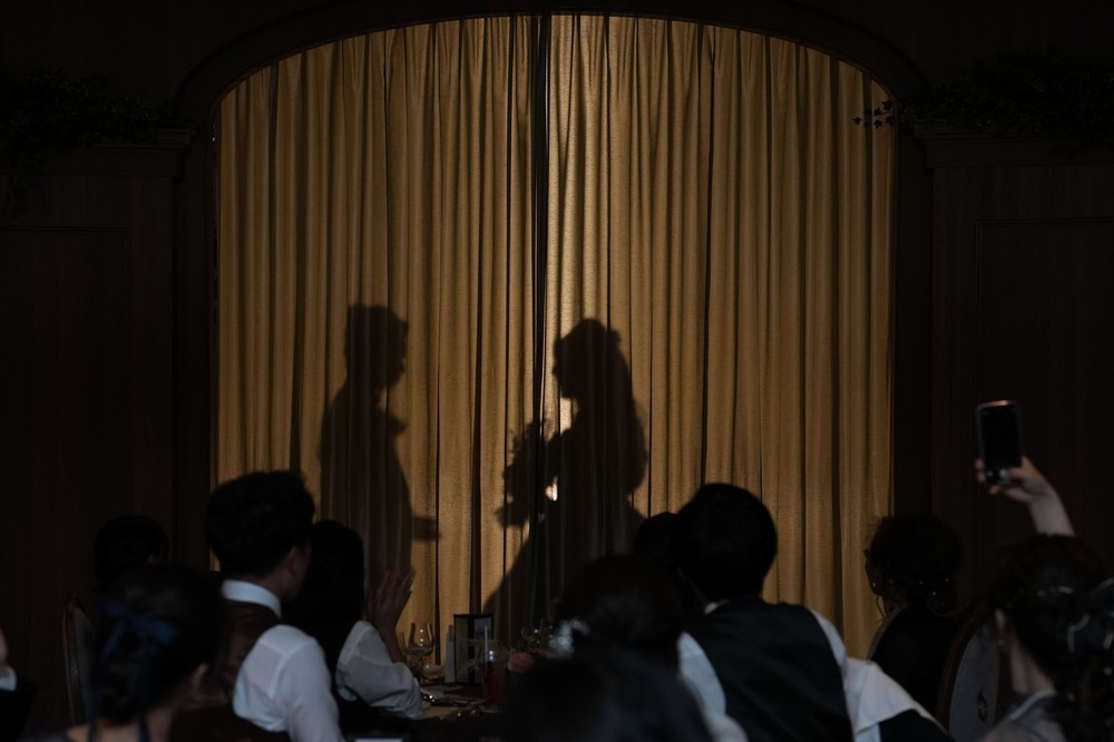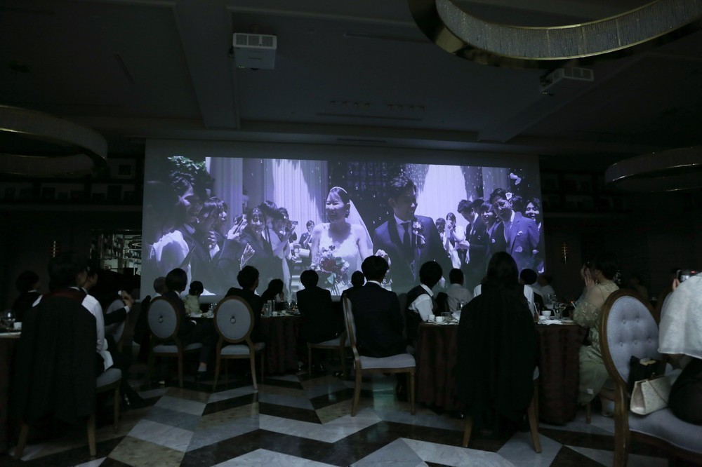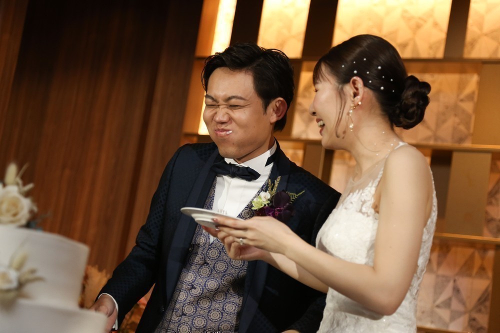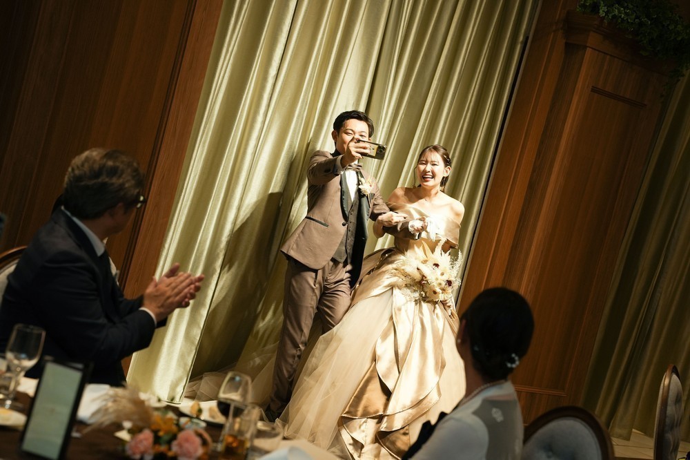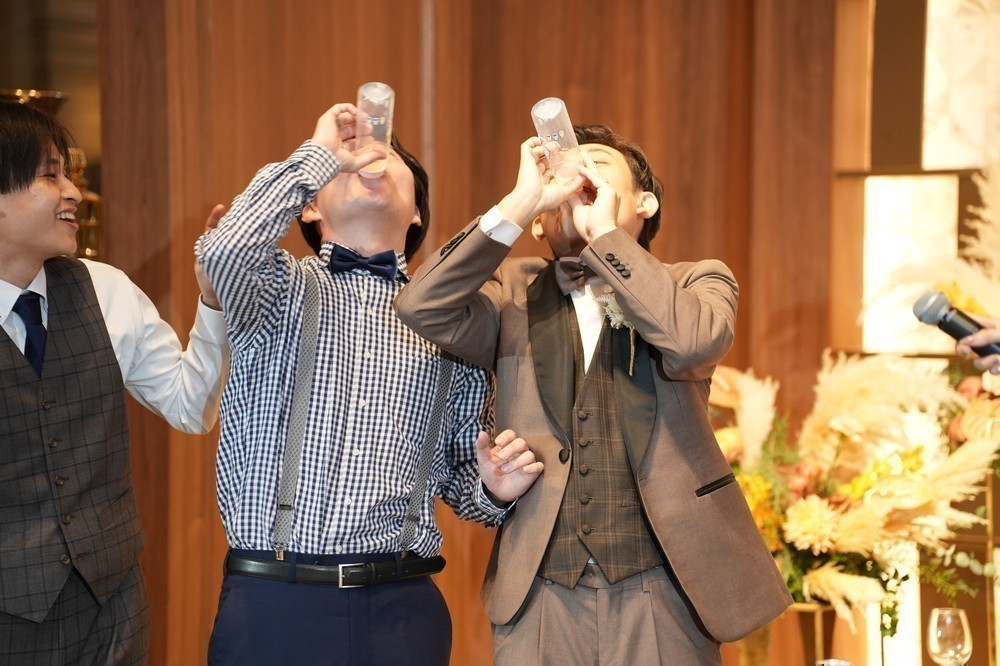 再入場では、カーテン越しのシルエット入場から盛り上がり、その後も新郎も一緒にグレープフルーツジュースの早飲み大会も行いました。