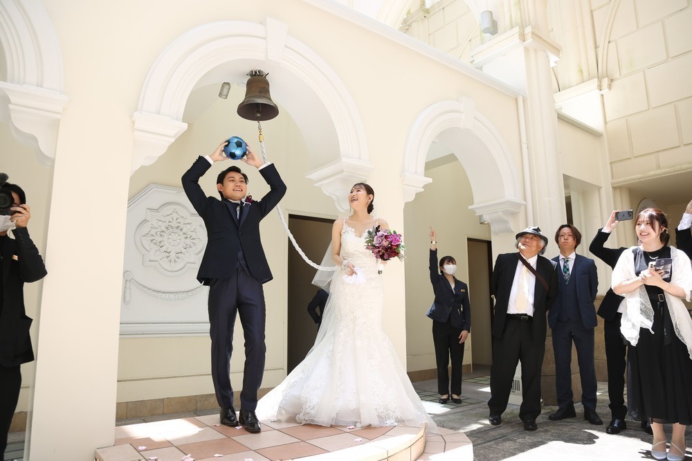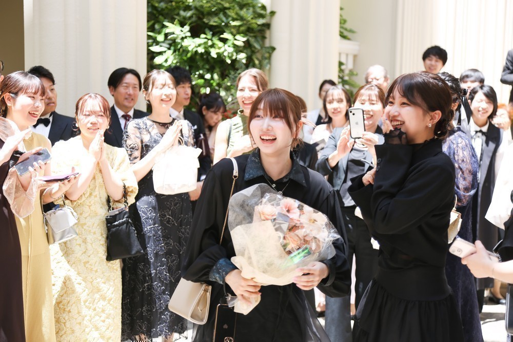 挙式後のブーケトスはみんなに楽しんでもらいたく、女性側はコスメブーケを、男性側はサッカーボールトスを行いました。明るい空間で楽しい時間が流れました。